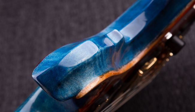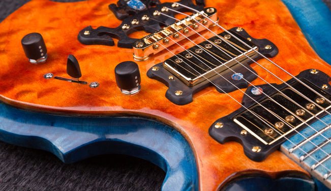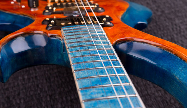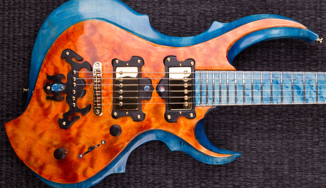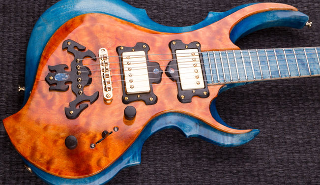 A Fantasy guitar inspired by Japanese custom ESP FRX in vibrant blue and orange using flamed maple