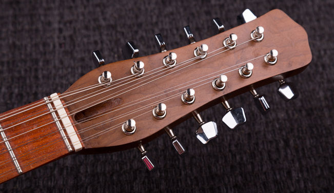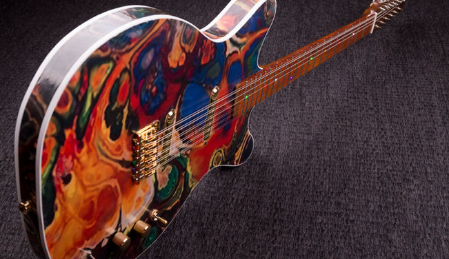 A beast of a guitar based on a 12 string danelectro with multi colored led fretboard inlays swirl fabric covering and double white body binding