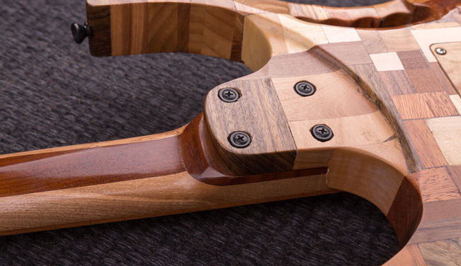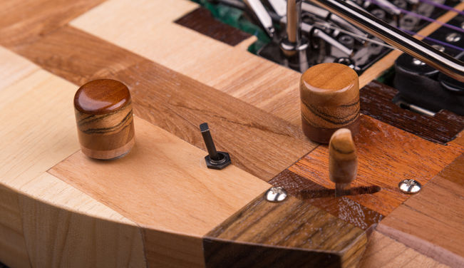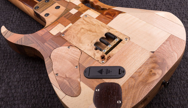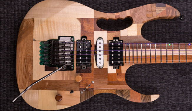 A minecraft Jem made entirely out of scrap wood and features a multi colored led inlay in the fretboard