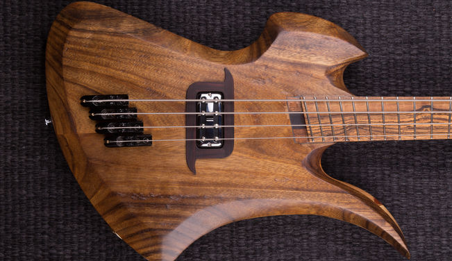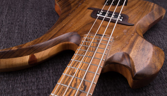 Den här multi- och kortskaliga basen med mensur 29-31 levererar rejält. Tajt, responsiv och kraftigt skulpterad med mjuka, svepande former. Avskalad till det mest nödvändiga med en enda pickup och inga kontroller för ren plug-and-play-känsla. Kropp och hals är byggda av överblivna bitar, toppade med exotiskt trä och avslutade med en konstnärlig regnbåge av snidade mönster över baksidan.